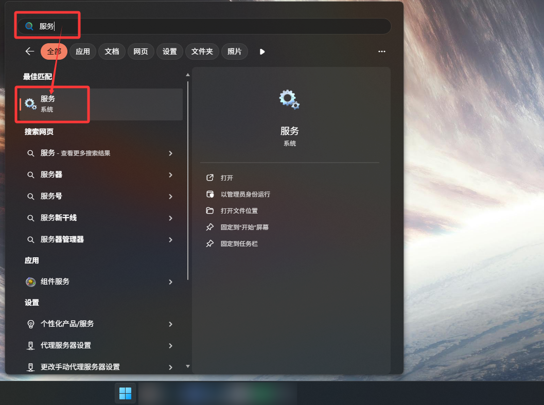 1.点击任务栏的菜单,在顶部搜索框输入“服务”,在匹配到的服务选项中点击进入。