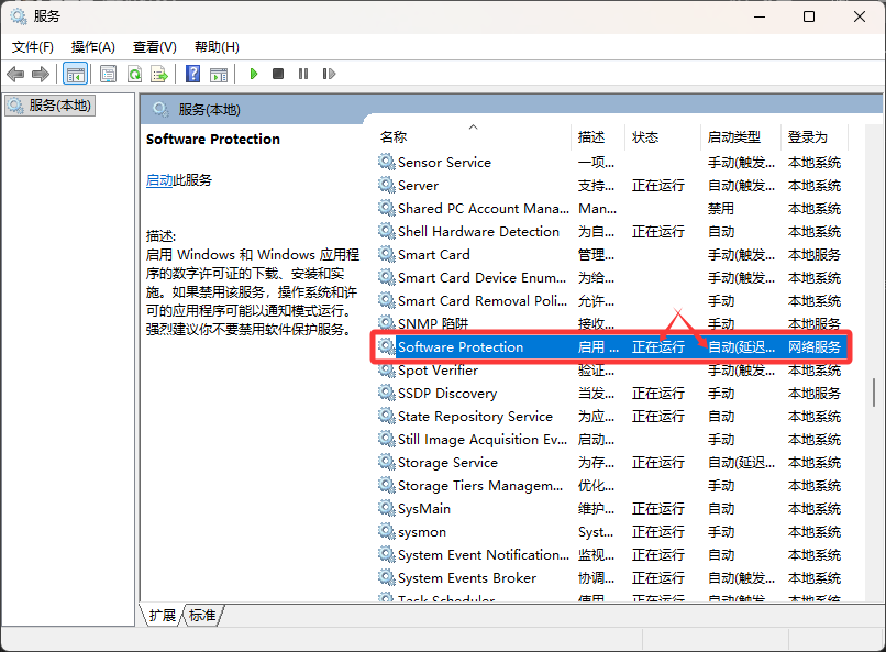 2.进入后,我们找到名为“Software Protection”的服务双击进入。