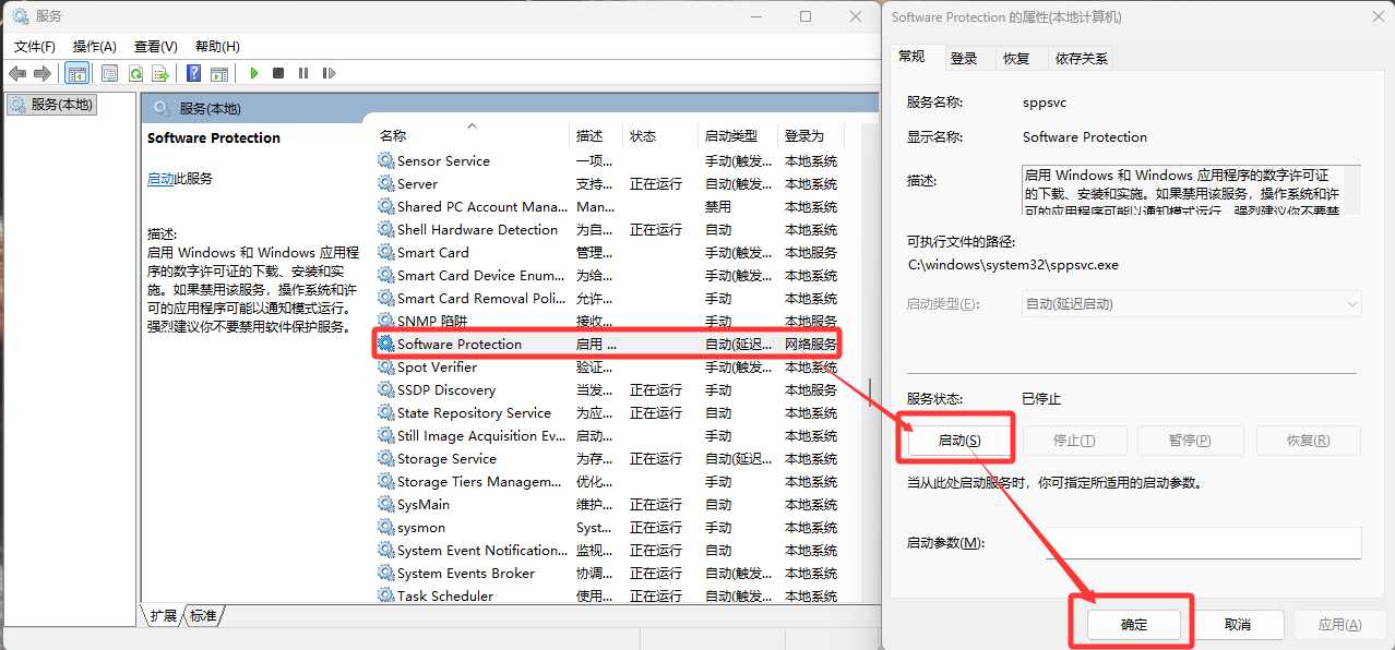 3.双击后出现新窗口后,将服务状态的“启动”点击,然后点击确定,重启电脑再尝试联网激活即可~(若已经是启动状态,则先点击停止,重启电脑之后再次点击启动,然后再次重启即可~)