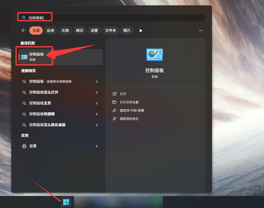 1.点击桌面底部的开始菜单,在出现的搜索框中输入“控制面板”选择对应的选项进入。