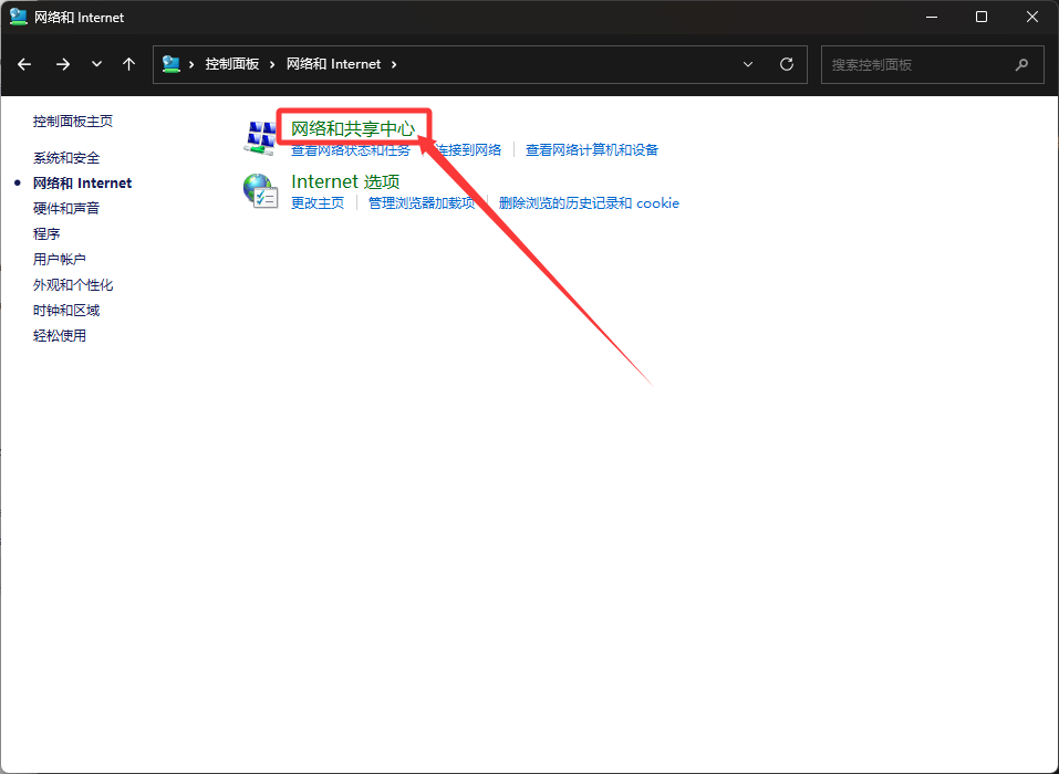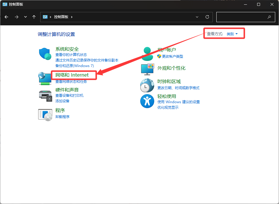 2.进入到控制面板后,将查看方式改为“类别”,然后选择“网络和interest”进入。