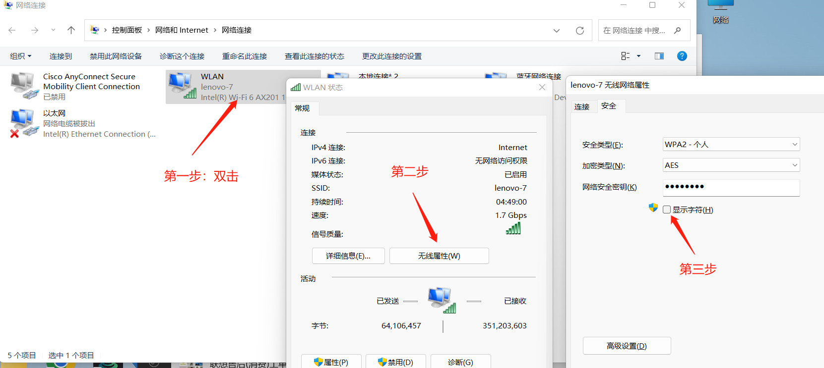 5.找到你所使用的WiFi图标双击进入,然后点击“无线属性”进入后,在顶部安全栏目中即可看到WiFi密码,点击“显示字符”即可查看密码。