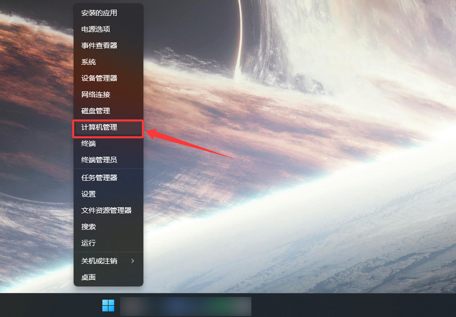 1.鼠标右击开始菜单,点击“计算机管理”。