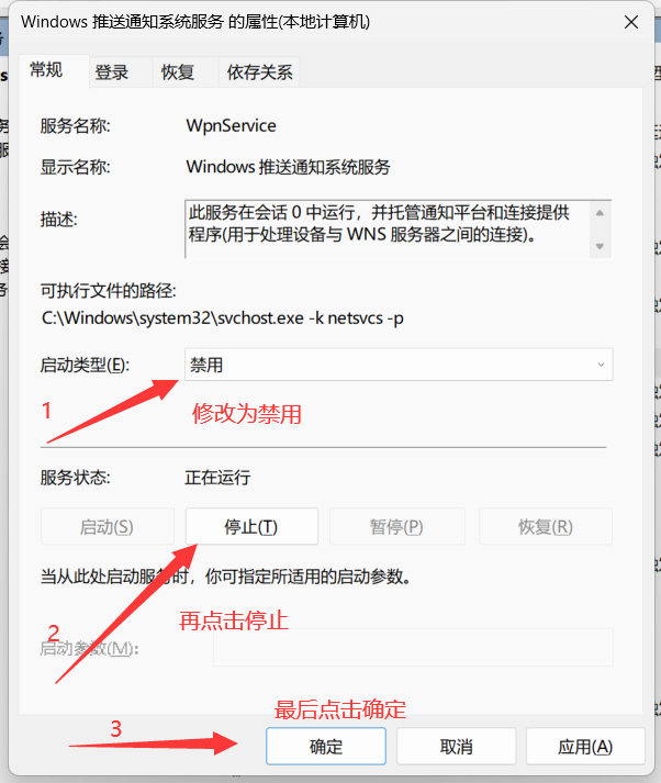 4.将启动类型修改为“禁用”,再点击“停止”按钮,重启电脑即可。