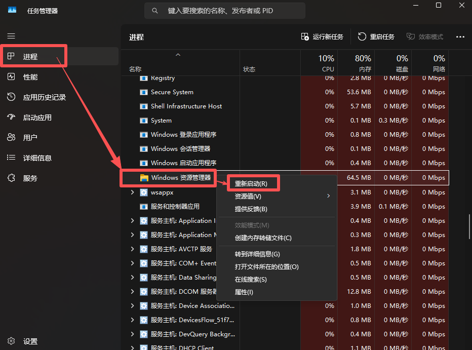2.在“进程”类目中下拉找到“Windows资源管理器”在该选项上点击右键,然后选择“重新启动”即可。