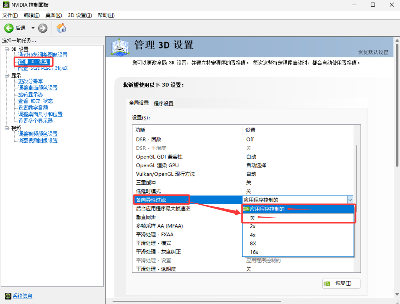 2.在出现的控制面板中,找到左侧的“管理3D设置”选中后,在右侧找到“全局设置选项”,然后找到“各项异性过滤”将其设置选择“关闭”或“应用程序控制的”,然后重启电脑。