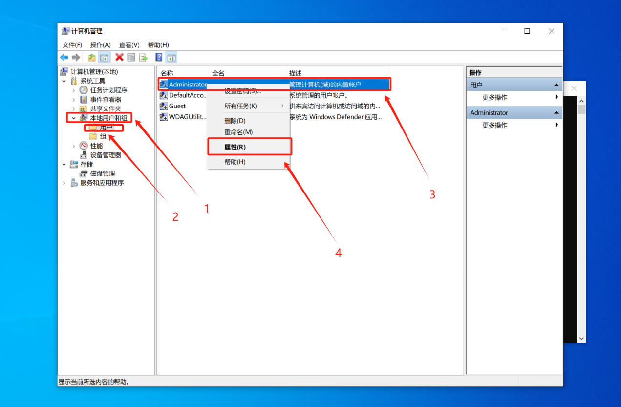 4.选择“本地用户和组”,然后选择“用户”,然后在账户名字上点击右键,选择“属性”进入。