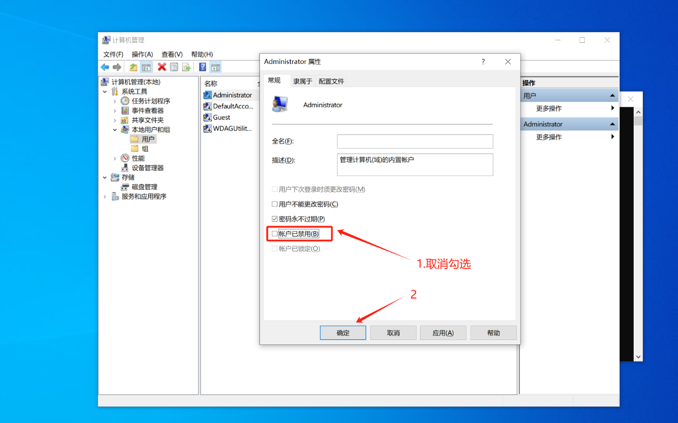 5.然后将“账户已禁用”取消勾选,点击确定后,重启电脑即可~