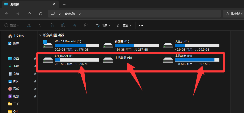 在此电脑中发现多了三个磁盘分区,且容量都不大,并且在磁盘管理中都查看不到有该三个分区