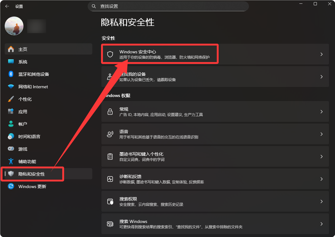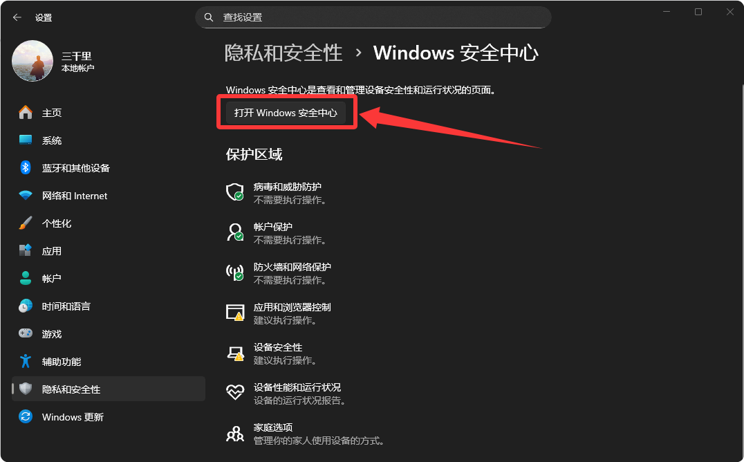 2.在“Windows安全中心”中选择“打开Windows安全中心”进入。