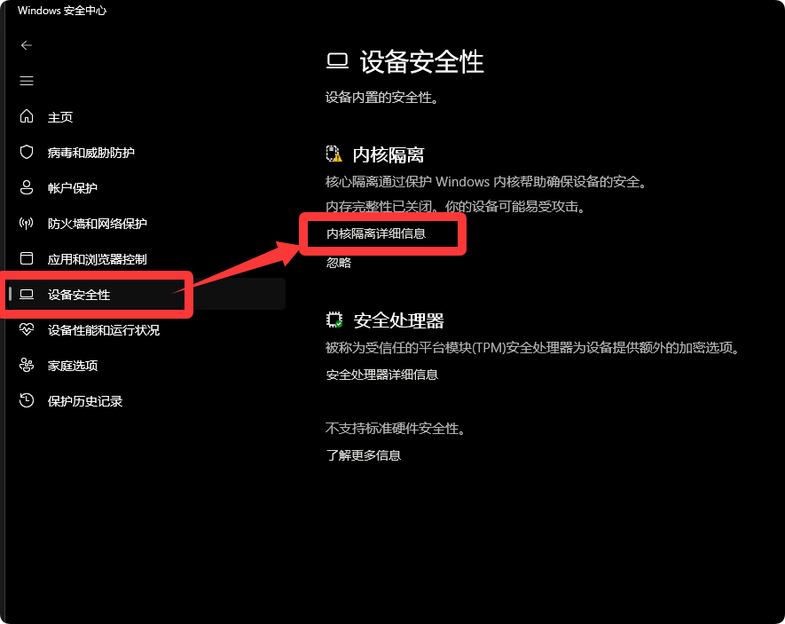 3.选择“设备安全性”栏,打开“内核隔离详细信息”进入。