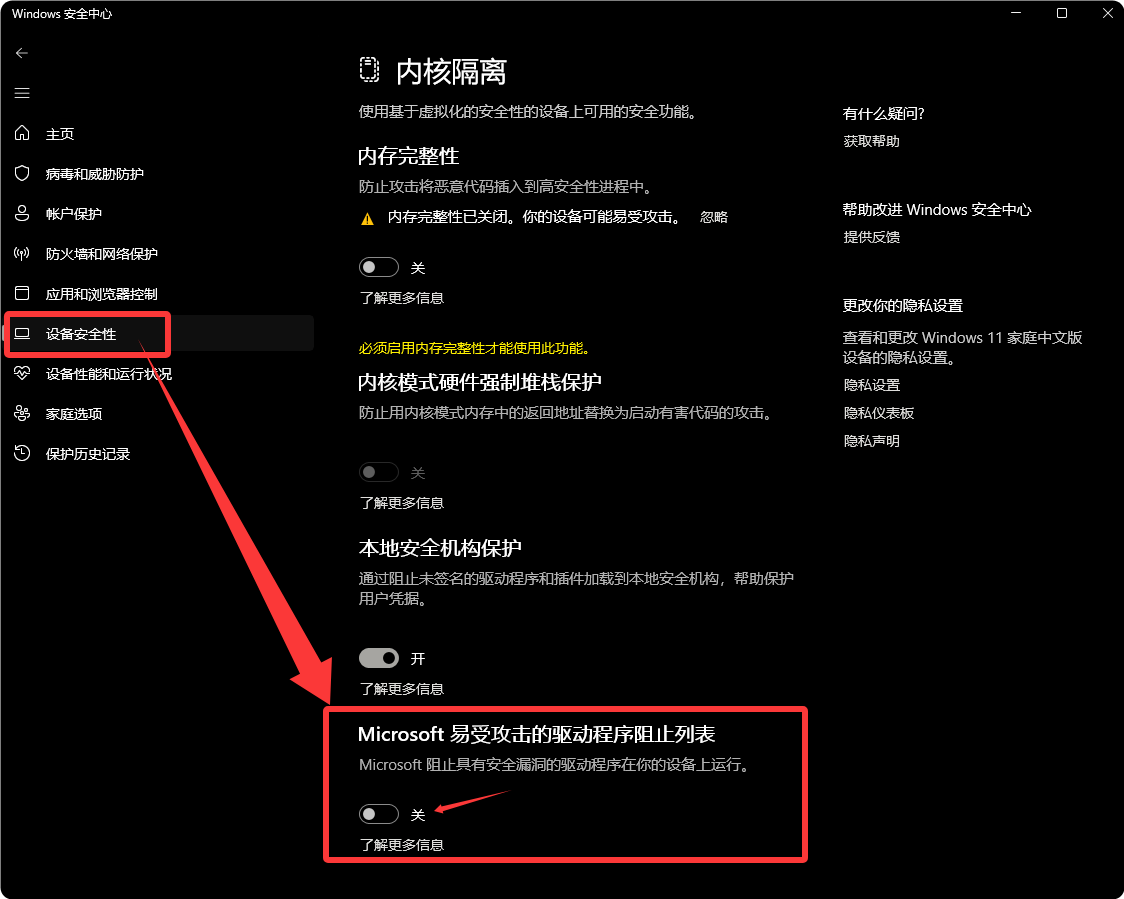 4.将“Microsoft易受攻击的驱动程序阻止列表”选择“关闭”后重启电脑之后再重新安装驱动即可。(若还是报错则将该页面所有的设置均设置关闭后再尝试) 所有办法都不行 重装系统即可解决。