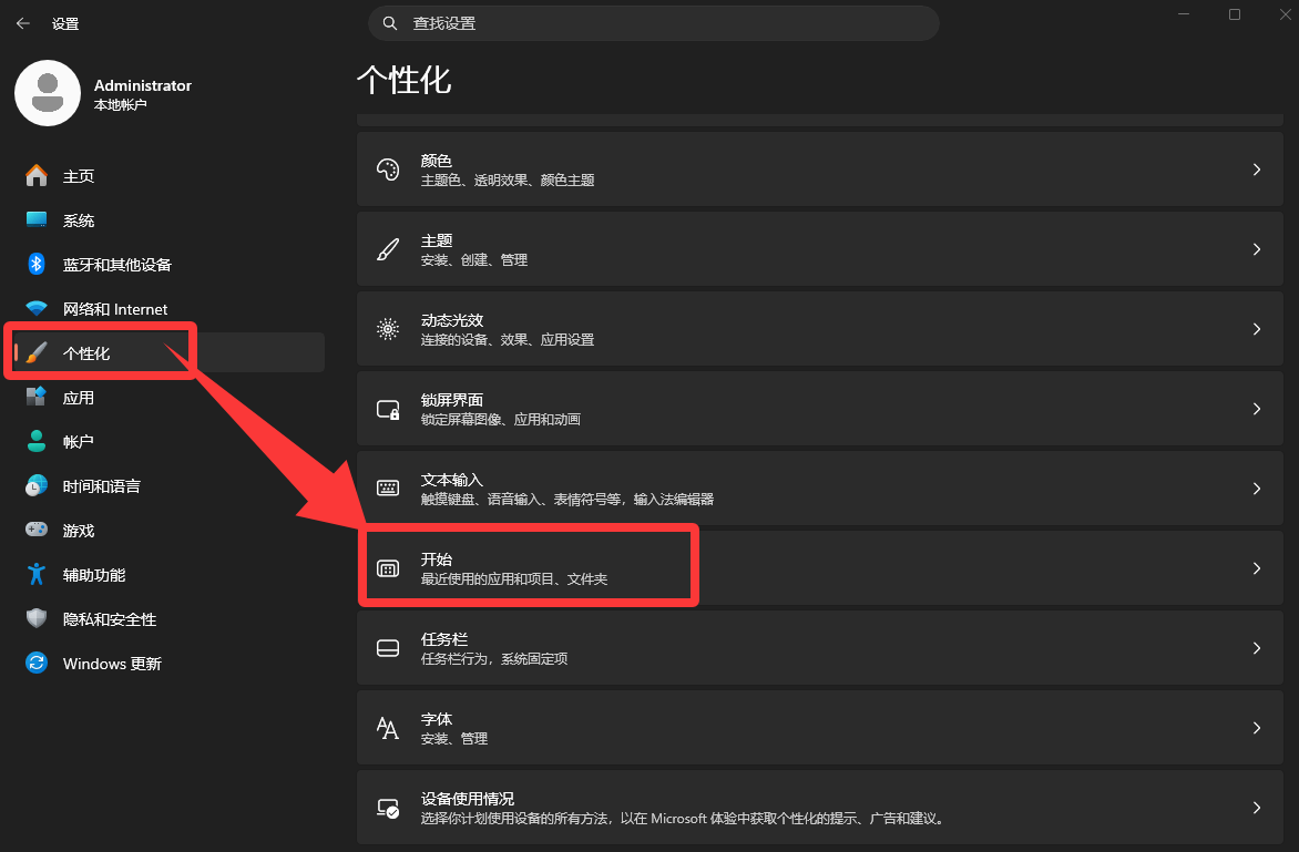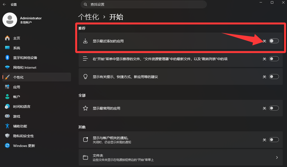 Win11关闭开始菜单中的“推荐的项目”