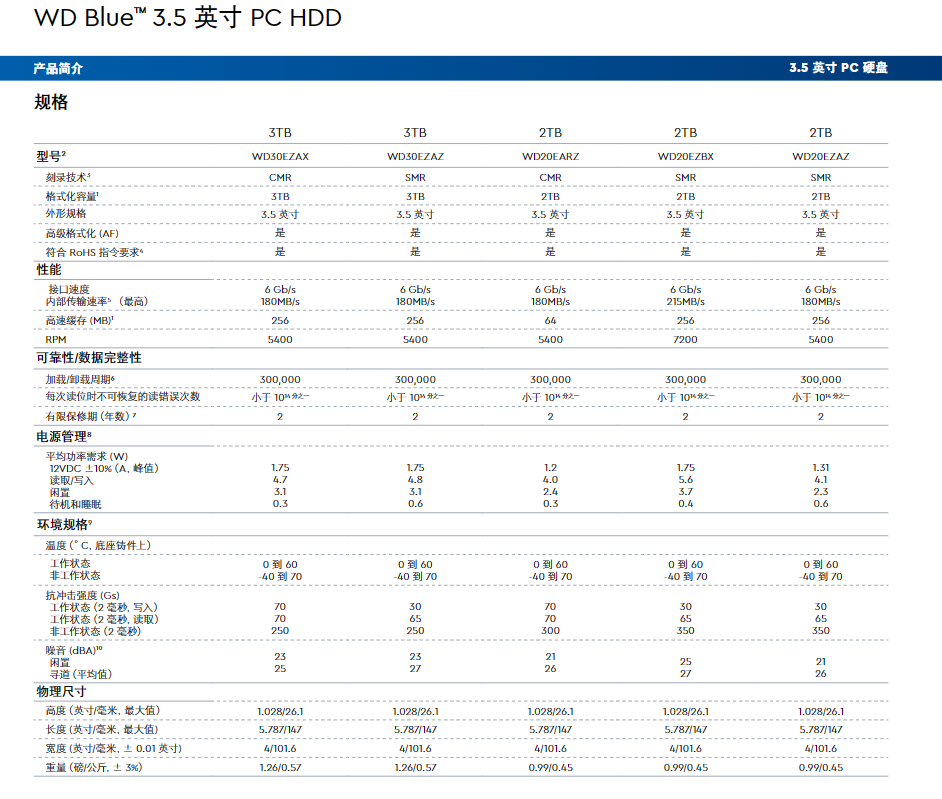 关于西数硬盘尾缀不同,导致硬盘参数之间会存在细微差异,例如西数 2T(WD20EARZ) 和西数 2T(WD20EZAZ),虽然都是西数的2T硬盘,但是后缀的参数不同依旧会导致参数有区别,当客户问到的时候,大家可以通过西数官方的参数表来对照差异。
